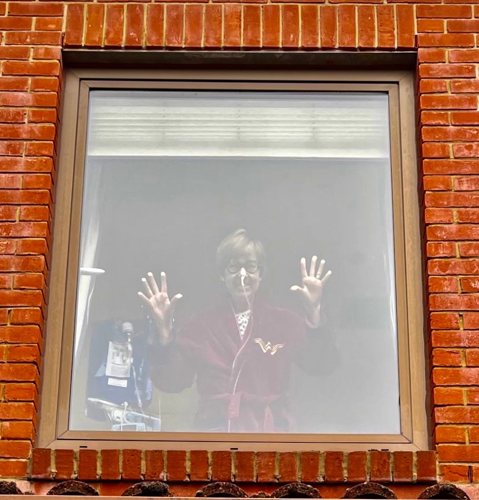 I hadn’t counted on it raining when I embarked on this morning’s visit. Nor that my presence in the car park would require an ABP being issued to deal with the strange man hanging around the refuse disposal area. Oh for a simple Hazmat Suit. Despite these tribulations, I got to see and talk to Brenda through the window on the phone for half an hour. I was able to drop off some mail and I left her delighting at the news that our Ocado order had all gone wrong without her overseeing things.
