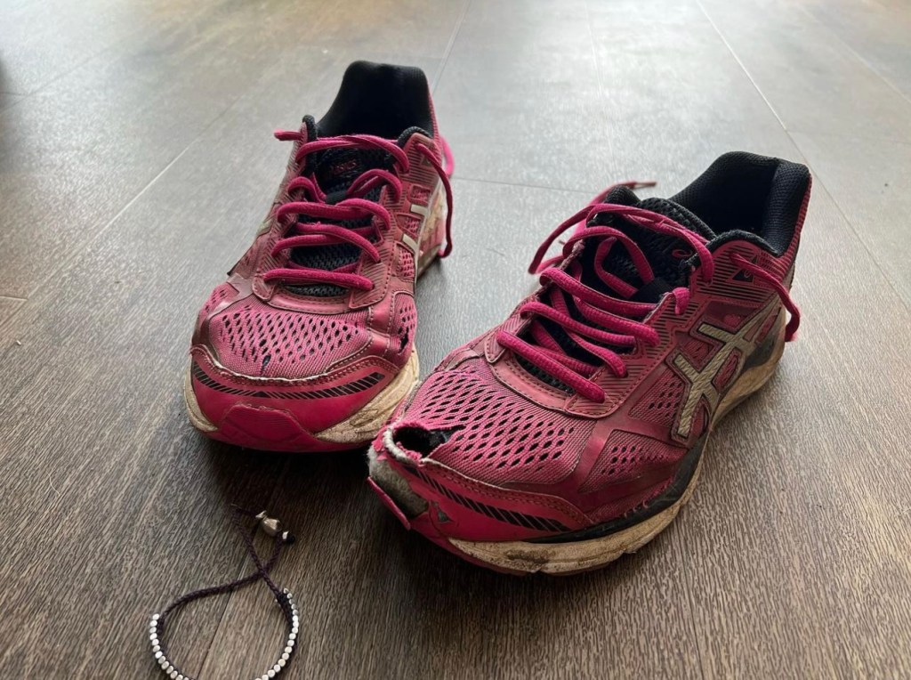 Madelaine writes ‘My lucky trainers and friendship bracelet from Brenda for tomorrow’s run. The trainers may look knackered but, having tried two new pairs these just work – and they’re the last pair I ran with Brenda in. Think I’m meant to wear them. Thanks for the sponsorship.’